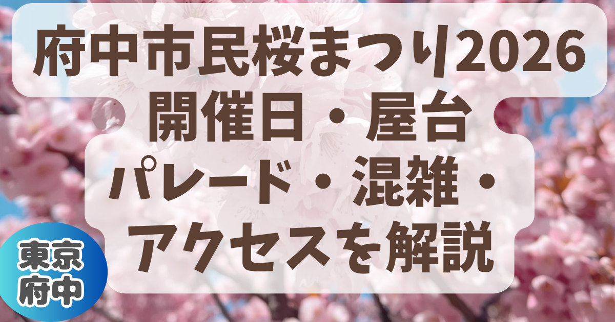 新着記事 2026.03.12 【港区】アークヒルズさくらまつり2026|屋台・夜桜ライトアップ・アクセスまとめ 2026.03.12 府中市民桜まつり2026|開催日・屋台・パレード・混雑・アクセスを解説 2026.03.12 日本橋さくらフェスティバル2026|ライトアップ時間・屋台・夜桜スポットも 2026.03.12 名古屋城桜まつり2026|見頃・ライトアップ・屋台・混雑・アクセス完全ガイド 2026.03.11 上野公園の花見屋台2026はどこ?上野桜フェスタの出店場所・おすすめ花見スポット・混雑予想 Post Share Hatena LINE note