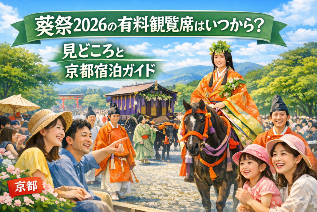 葵祭2026は5月15日(金)開催予定で、雨天時は5月16日(土)に順延、判断は前日18時頃に発表されます。観覧の軸になる有料観覧席は京都御苑と下鴨神社参道に設置され、2026年は先行抽選販売と一般販売の両方が案内されています。