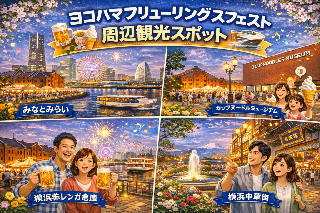 ヨコハマフリューリングスフェストは、赤レンガだけで旅を終えるより、周辺観光までつなげると宿泊の価値が上がります。横浜赤レンガ倉庫は、海に面したロケーションと多彩なイベントが魅力の観光拠点として案内されています。